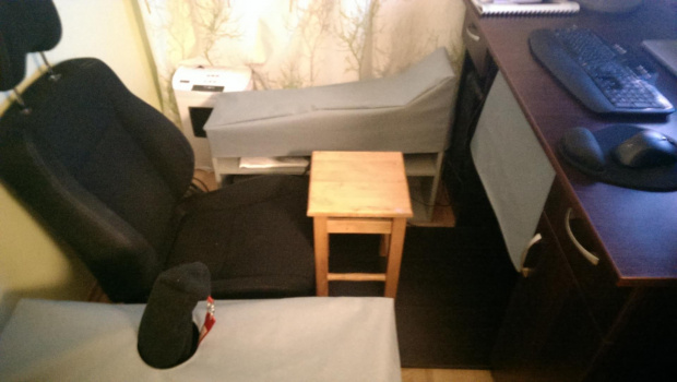Co do używania tej regulacji, to zgodnie z założeniami mój kokpit ma być modularny i jak nie będę latał to chciałbym głębiej chować stery kierunku aby nie przeszkadzały w pracy biurkowej. :) Przetestowałem układ z fotelem samochodowym, i jak go odsunę do tyłu to mogę przed fotel wsadzić stołek kuchenny i siedzieć normalnie przy biurku. :)