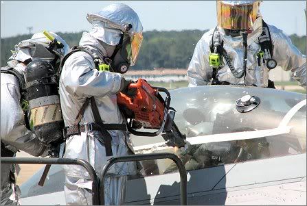 A fire crew had to cut open the canopy of a US Air Force Lockheed Martin F-22A Raptor fighter with chainsaws on 10 April to free the pilot, who had been trapped inside for 5h.