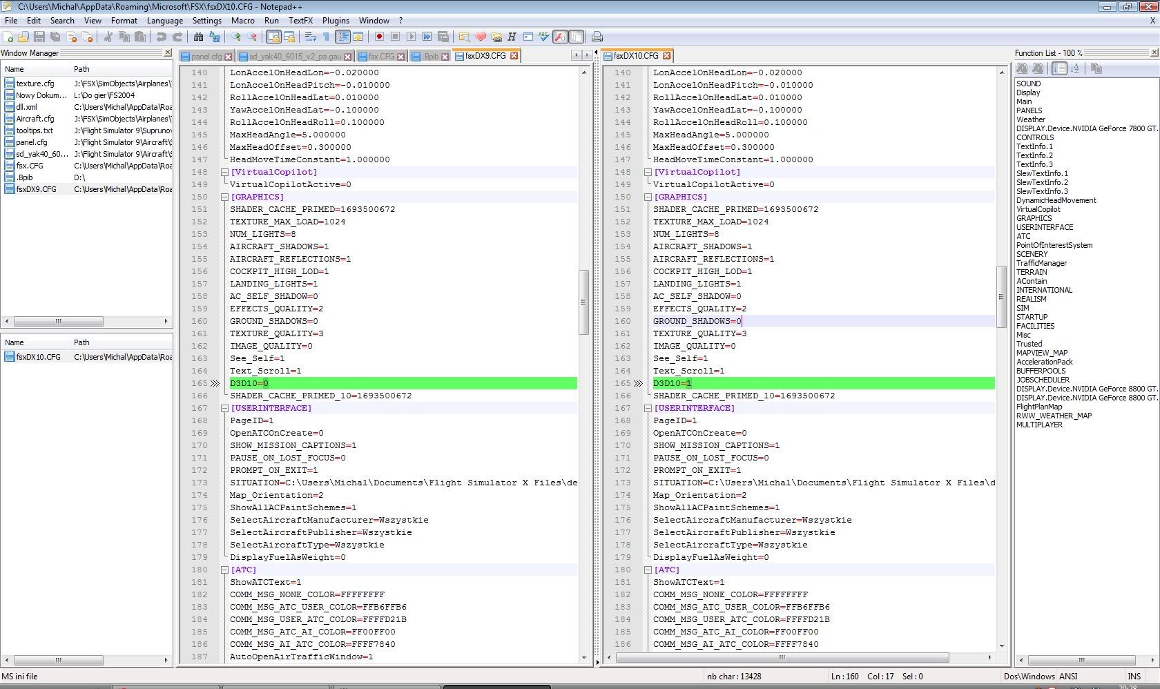 Narzędzie którego używam między innymi do pisania postów na forum. Jak nazwa wskazuje jest to notatnik na sterydach i ma bardzo duże możliwości. Pozwala na podgląd i edycję tekstowo lub binarnie praktycznie wszystkich plików (dodaje rozszerzenie powłoki "edit with notepad++"). Umożliwia proste przełączanie pomiędzy otwartymi plikami poprzez mechanizm zakładek. Koloruje składnię większości języków programowania, ale także plików konfiguracyjnych dzieląc je na poszczególne sekcje. Posiada bogaty asortyment narzędzi do modyfikacji tekstu rozszerzanych jeszcze przez dodatkowe pluginy oraz prosty engine wyrażeń regularnych. Co najważniejsze uruchamia się równie szybko co windowsowy notatnik. Przykładowo poniżej screen pokazujący działanie pluginu compare porównującego zawartość plików na przykładzie plików konfiguracyjnych FSX, widać po prawej listę sekcji zawartych w pliku. Program darmowy.