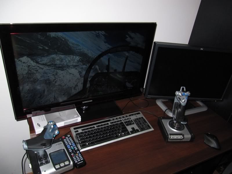 Przetestowałem dzisiaj z komputerem telewizor 32" Samsung LE32C550 który stanie w drugim pokoju i po krótkich bojach z konfiguracją rezultaty są jak dla mnie bardziej niż dobre. Gry na tak dużym ekranie z typowo biurkowej odległości ~1m wyglądają świetnie. Czort wie co to za matryca, ani ostrość ani przejścia tonalne nie są tak dobre jak na monitorze HP LP2475w z S-IPS którego używam na co dzień, ale do grania w zupełności wystarczające. Input laga nie stwierdziłem podobnie jak smużenia którego nie widać nawet w sztucznych sytuacjach, w których dostrzegam je na monitorze. Jasność można regulować w bardzo dużym zakresie, nawet większym niż monitor, więc nie ma problemu z używaniem w ciemnym pomieszczeniu. Trochę liczyłem na to że w porównaniu z monitorem poprawi się w symulatorach czytelność przyrządów na dużym FOV, ale tutaj ograniczeniem jest rozdzielczość. Po prostu w 1920x1080 na dużym oddaleniu widoku teskty na HUD i MFD przestają być czytelne większy ekran tu nie pomoże.