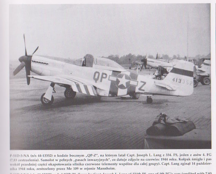 "Bitwy lotnicze - P-51D/K Mustangi nad III Rzeszą" wydawnictwa kagero. Na str 5. piękne zdjecie P-51D-5-NA (ns 44-13352) z 344 FS na którym są namalowane pełne pasy inwazyjne.