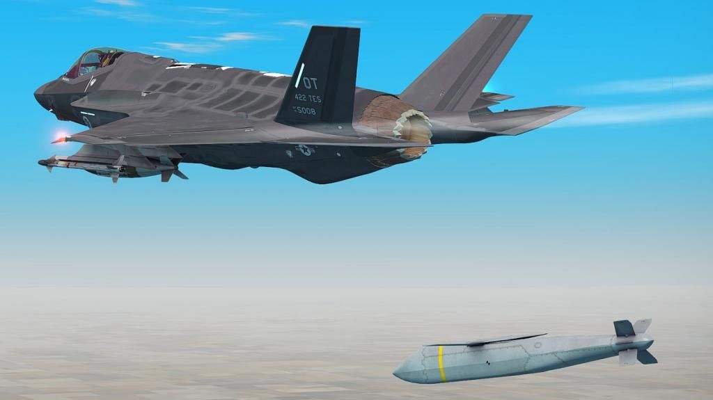 Pierwsze odpalenie AGM-154C, piekielnie celny "szybownik". Da się też nim atakować w opcji Pre Planned, czyli nawet bez widoczności celu dla pilota.