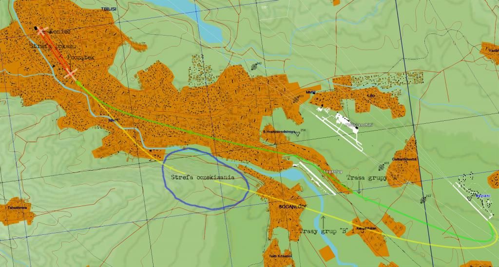 Tymczasem grupa "A" poleci prosto do oznaczonej na mapie Strefy pokazu, utrzymując wysokość 80 - 100m (260 - 330ft) AGL. Strefa ta to odcinek drogi w Tbilisi. Jej początek i koniec wyznaczają skrzyżowania oznaczone na mapie białym kolorem.