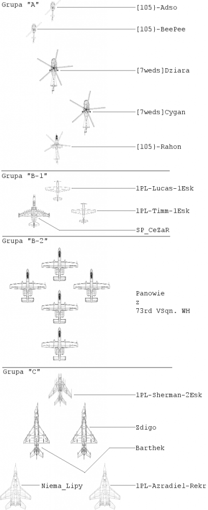 To by było na tyle, jeśli chodzi o "program obowiązkowy". Wiem, że z opisu może się to wydawać skomplikowane, ale takie nie jest. Główny ciężar "operacji" spoczywać będzie na barkach Flight Leaderów, a tymi zostaną raczej osoby, które będą w stanie go udźwignąć. Pozostali uczestnicy będą musieli po prostu wystartować, utrzymać się w formacji, wylądować i tyle.