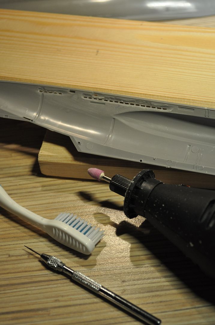 Na początek otwory przelewowe bo model ma tam zaślepki. Wykorzystałem do tego szlifierkę, a potem przekłuwanie. Otwory są malutkie bo to skala 1:144.