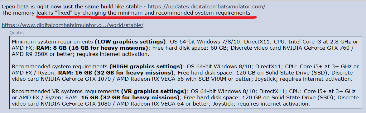 The memory leak is "fixed" by changing the minimum and recommended system requirements.