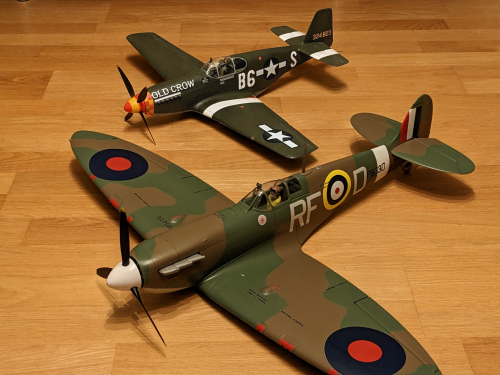 Spitfire'y, podobnie jak inne herbaciane samoloty, raczej nie różniły się zbytnio w kamuflażach. Trzeba tylko ustalić czy to schemat A czy B.  Spitfire I (P9555 RF-D) mógł mieć lewe skrzydło czarne a resztę spodu w kolorze SKY. Spitfire II RF-D latał z nr. P8040 ale pewności nie mam.