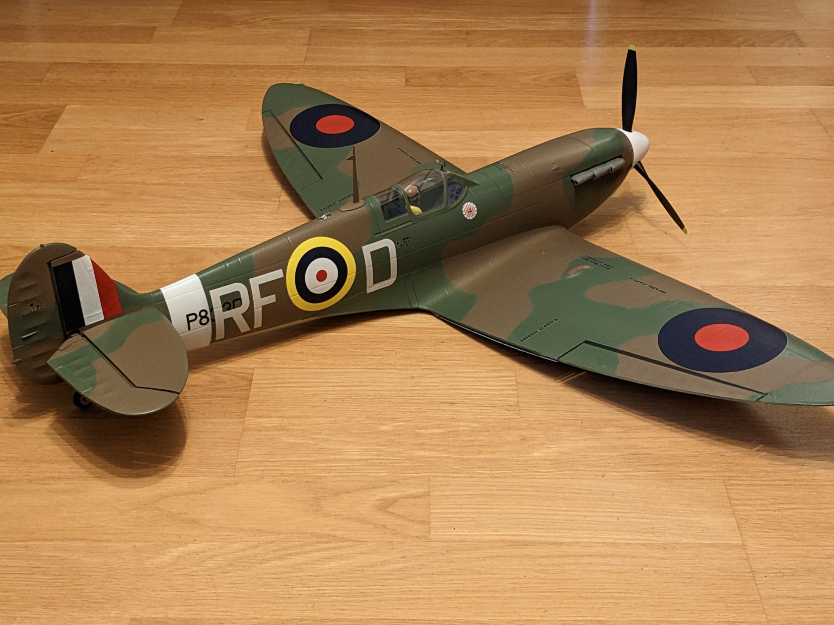 Prezentuję postęp z prac nad Spitfirem i jak to wyszło z tym "malowaniem". Jest to elektryczny model RC od Durafly 1100mm. Na razie tylko wstępnie poskładany i oklejony. Co do malowania, to będzie jeszcze delikatny weathering, ale raczej po oblocie, który planuję na początek przyszłego miesiąca. Na fotkach nie widać, ale Spit ma w pełni funkcjonalne podwozie i klapy.