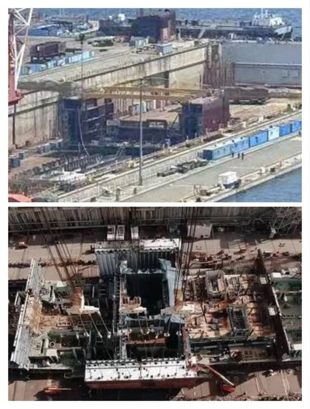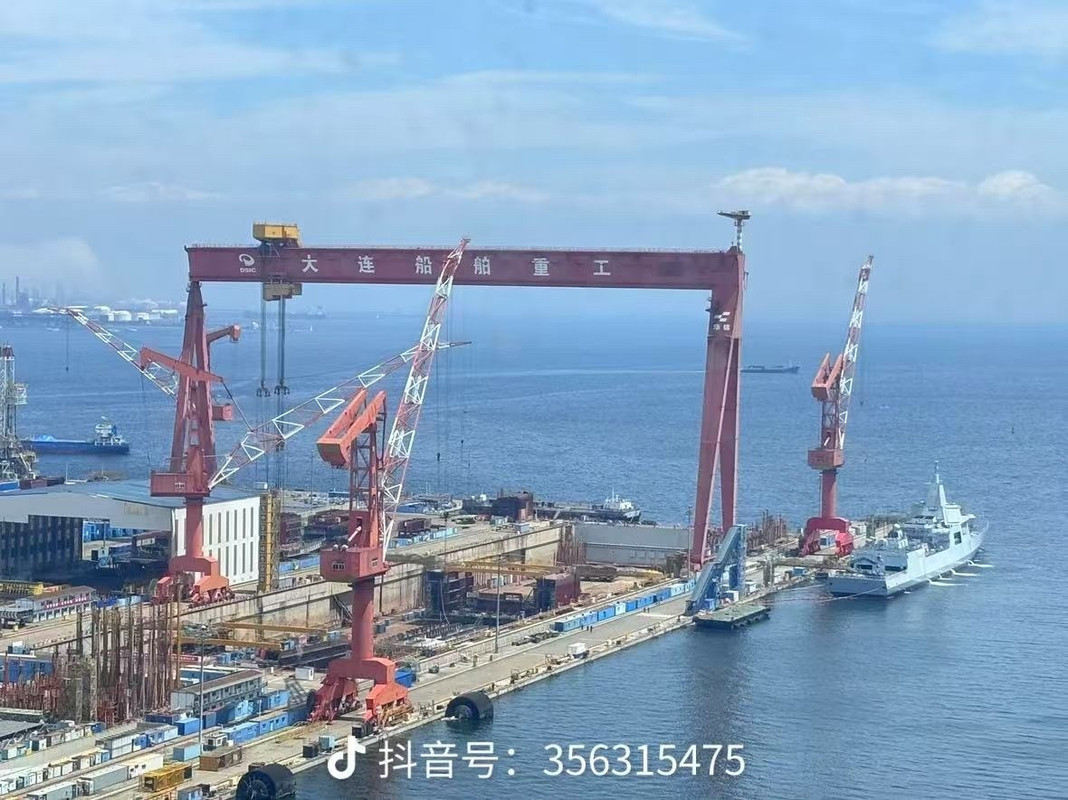 Stocznia w Dalian. Tu według Chińczyków powstaje ich przyszły lotniskowiec o napędzie atomowym (patrz elementy w suchym doku). Przy nadbrzeżu zacumowany niszczyciel typu 055 (jest zatem punkt odniesienia):