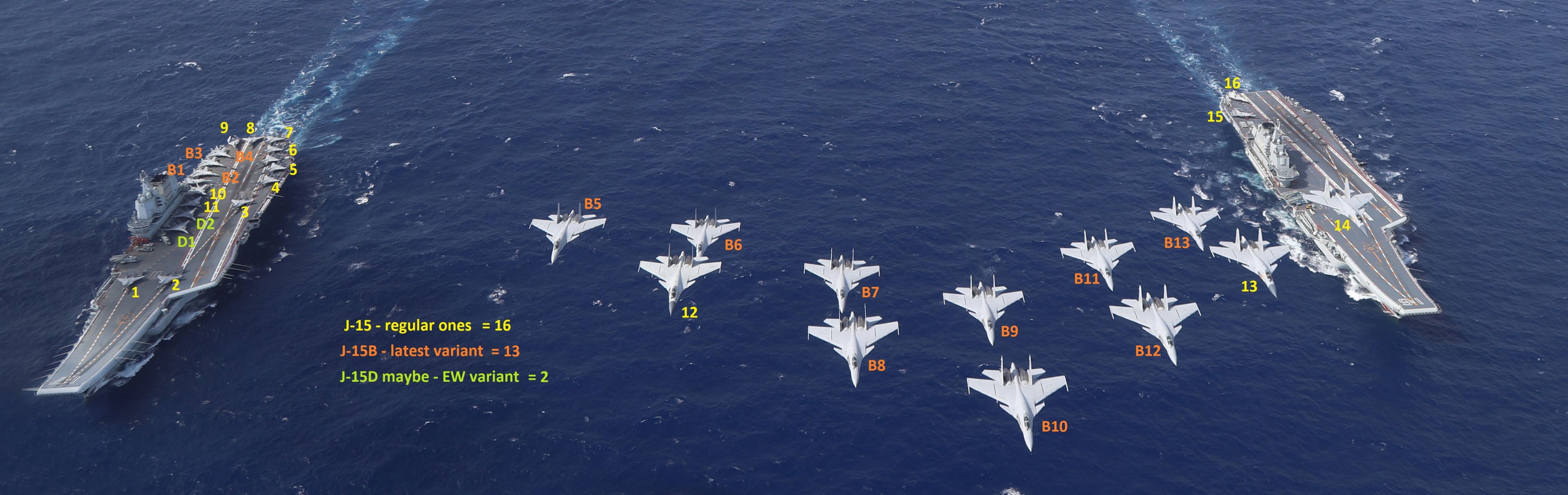 Pod koniec października 2024 Chińczycy przeprowadzili pierwsze ćwiczenia z jednoczesnym użyciem dwóch lotniskowców: Liaoning (16) i Shandong (17). Odbyły się one na Morzu Południowochińskim.