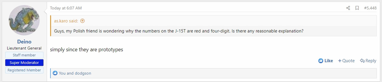 Na tych nowych zdjęciach z Fujian jeden szczegół mi się rzucił w oczy - otóż J-15T otrzymały czerwone, czterocyfrowe nr taktyczne (np 1513, 1516). Do tej pory widywane były z nr szarymi i dwucyfrowymi.