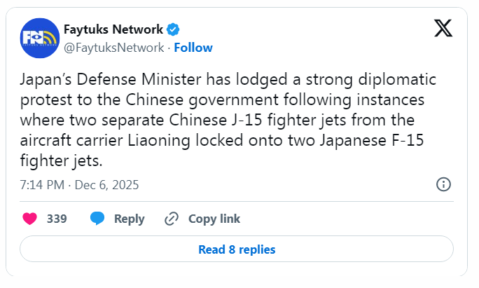 Chińczycy prowadzą obecnie duże ćwiczenia na morzu z udziałem około setki okrętów (w tym dwa lotniskowce i dwa śmigłowcowce). Japończycy wysłali F-15, aby przyjrzeć się temu z bliska. Piloci chińskich "rekinów" zareagowali, robiąc to do czego służą ich maszyny - tj. zapewnili osłonę zespołowi okrętów z powietrza. Dali znać "dżapsom": Wypad stąd! Poskutkowało.