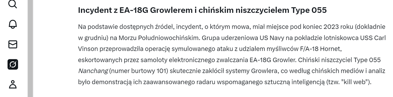 Dla wszystkich zbulwersowanych chińskim działaniem "fanbojów" USA, to chciałbym dodać, że US Navy nie zachowuje się bynajmniej inaczej w podobnych sytuacjach. Ba, Amerykanie potrafią działać bardziej prowokacyjnie, bo czysto ofensywnie. Udowodnił to choćby incydent z grudnia 2023r, o którym już tu kiedyś wspominałem. Na zespół ćwiczących chińskich okrętów, Amerykanie postanowili przeprowadzić symulowany atak lotniczy z użyciem grupy F-18. Skończyło się kompromitacją "najpotężniejszej marynarki świata", gdy niszczyciel typu 055 nr 101 Nanchang "nakrył czapką" Growlera próbującego zapewnić osłonę radioelektroniczną atakującym samolotom. Amerykanie wystraszeni utratą osłony uciekli, a dowódca Growlerów żalił się w prasie, że on nigdy czegoś takiego na oczy nie widział ;D. Przypłacił to zresztą utratą stanowiska :P.