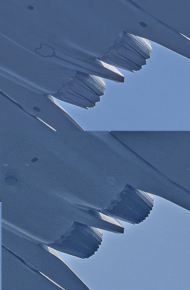 Porównanie od spodu J-35 i J-35A. Jak widać, nie tylko wielkość skrzydeł, obecność haka do lądowania, czy też wzmocnionego podwozia odróżnia obie te maszyny. Zmian jest więcej: zupełnie inne pokrywy podwozia, różnice w wielkości lotek i klap, inne typy soczewki Luneburga (ta na wersji A jest wciągana do wnętrza maszyny), a także zupełnie inne dysze wylotowe silników. Nie będę jednak zgadywał, czy obie maszyny mają inne silniki, bo nie wie tego nawet taki ekspert od "chińszczyzny", jak Andreas Rupprecht.