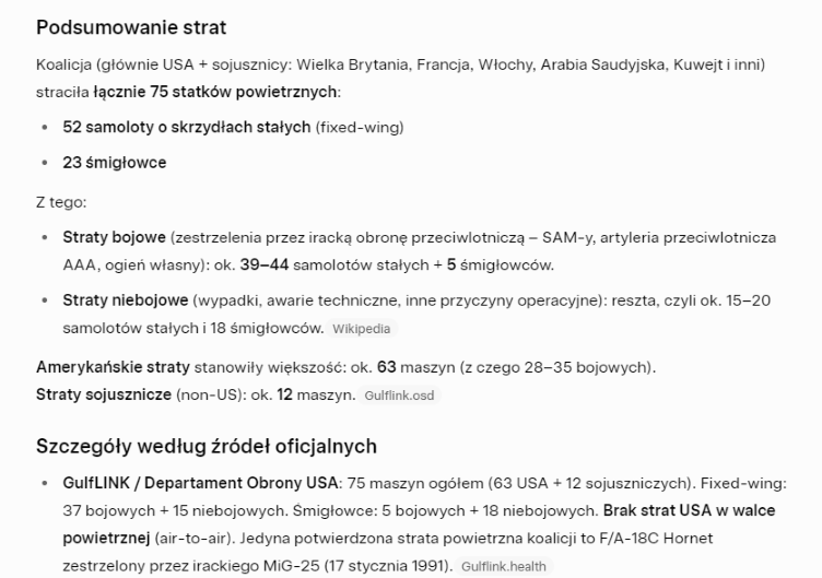 Kolejna rzecz, którą pomijasz, to to, że w statystykach z Pustynnej Burzy są tylko samoloty zniszczone i spisane ze stanu. Nie obejmują maszyn uszkodzonych, które dało się naprawić. Więc liczenie każdej "prawdopodobnie" uszkodzonej maszyny w obecnym konflikcie jak zniszczonej też jest mocno na wyrost.