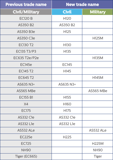 Ściąga do nowych oznaczeń (marketingowych) produktów Airbus Helicopters.
