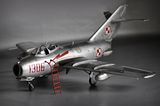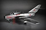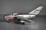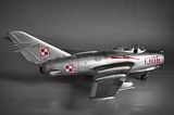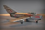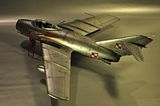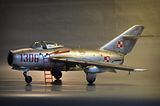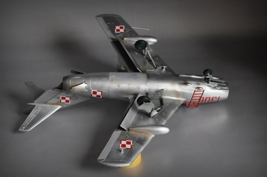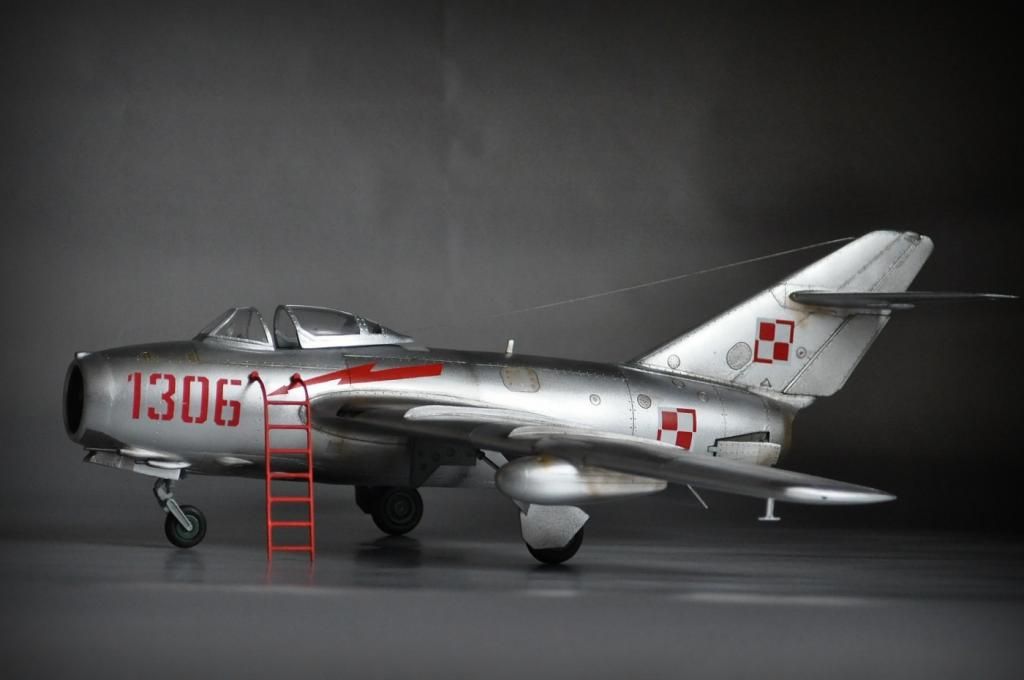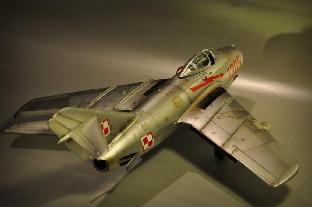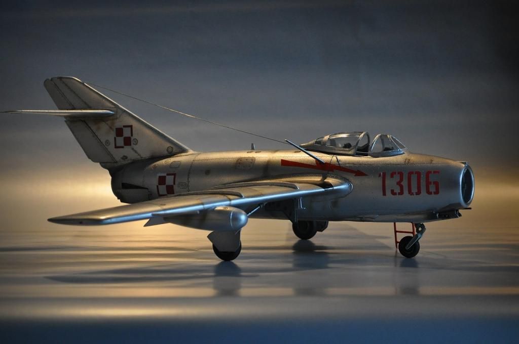 No i finito. Model Lim-2 (MiG-15bis) 1:32 Trumpeter ukończony. Jak pisałem, zrobiłem jak umiałem, faktycznie kiedyś się bawiłem w modelarstwo, ale to było ze 20 lat temu chyba  :102:, więc o takich cudach jak gumowe oponki czy coś to się nawet nikomu nie śniło. Trzeba było samemu kombinować z szafy babci, co można wykorzystać, a szafa była sporawa :]. Fajnie, że jest co postawić teraz. Model był malowany polskimi farbami Bilmodel (i w sumie je polecam, ale faktycznie nie są to proste farby w obsłudze, mają za to wiele zalet i się nie ścierają). Całość potem pokryta półmatem Italeri, co ciekawie, przy tym lakierze Bilmodel zachował swój odcień. Z braku kalkomanii do tej skali - kombinowane. Szachownice Techmod, numer 1306 z jakiejś niemieckiej firmy, ale trochę tutaj było wycinania by pasował jak w oryginale. Piorun namalowany za pomocą szablonu i aerografu. Do tego widać, że trochę się chyba nastał na płycie, ale wciąż na chodzie ;]. Sam model wykonałem prosto z "pudełka", bardziej jako przypomnienie sobie tego i owo i ew. poznanie czegoś nowego, nie ma tutaj żadnych udziwnień. Sam model ma błąd, niestety później to zauważyłem, nieco wyżej powinien być poprowadzony słupek anteny. No nic trudno. Dzięki też za wszelkie rady.