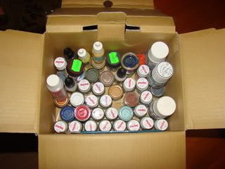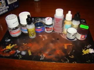 Jak widać używam farb wielu producentów, a to dla tego, że kupowałem kiedyś po kilka egzemplaży(egzemplarzy) żeby znaleźć te najbardziej mi odpowiadające. Teraz kupuje tylko Humbrola (bo jest bardzo trwały) i Pactrę. Jako podkładki używam okładki od bloku techniczne, bardzo dobrze zabezpiecza stół przed uszkodzeniem np: skalpelem.