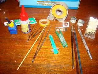 Używam także wiele, wiele innych rzeczy których tu nie pokazałem takich jak: zapałki, wykałaczki, rajstopy (nie moje  :004:) do robienia lin i naciągów, żyletki, pastele i wiele innych.