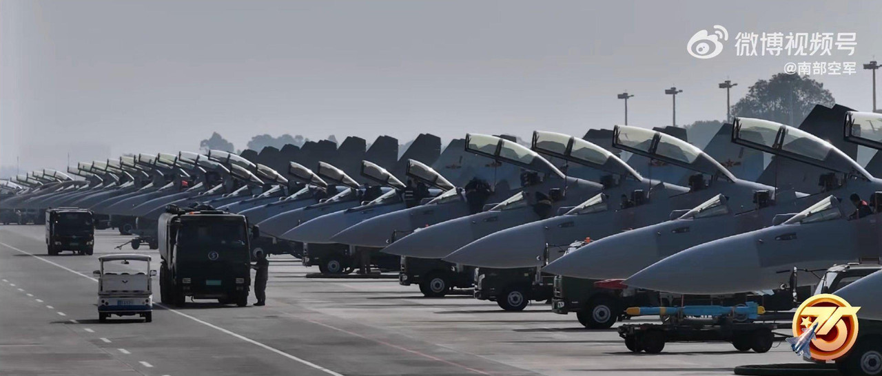Niezły szereg :D. Niemal 30 maszyn. Same "Flankery". Widać 6 Su-35 (też chińskich. Posiadają 24 sztuki zakupione od Rosji), reszta to J-16: