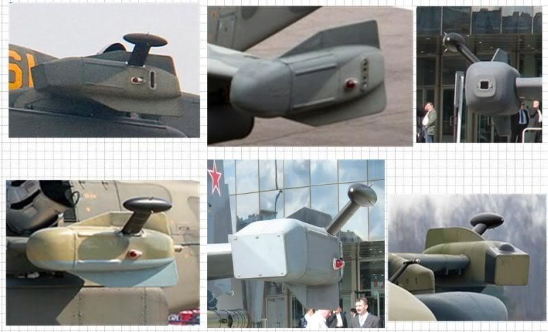 Dokładnie tak, różna konfiguracja tych zakończeń dotyczy różnej aparatury. Półokrągłe zakończenie na prototypach mieściło najprawdopodobniej stację L-150-52 (SPO-32) Pastel, to ze szklanym okienkiem na zdjęciu nr 3 to czujnik L-140 Otklik, to czarne odstające coś to element SIWPW-52: Sistema Izmierenija Wozdusznych Parametrow Polieta Wiertolieta (